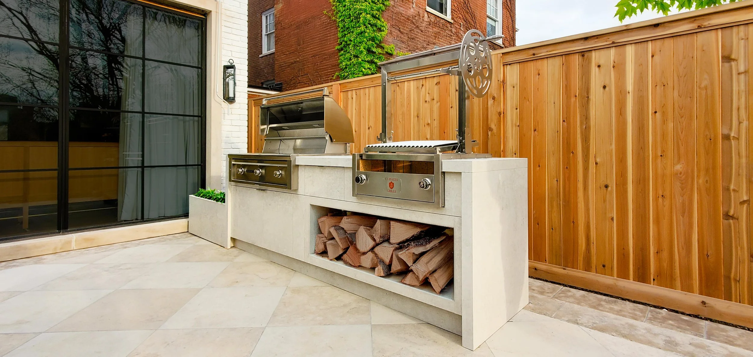 Countertop: Dekton Laos | Endura Graphite Grey | Appliances: Fontana Forni Mangiafouco Pizza Oven, 42” Lynx Sedona Grill